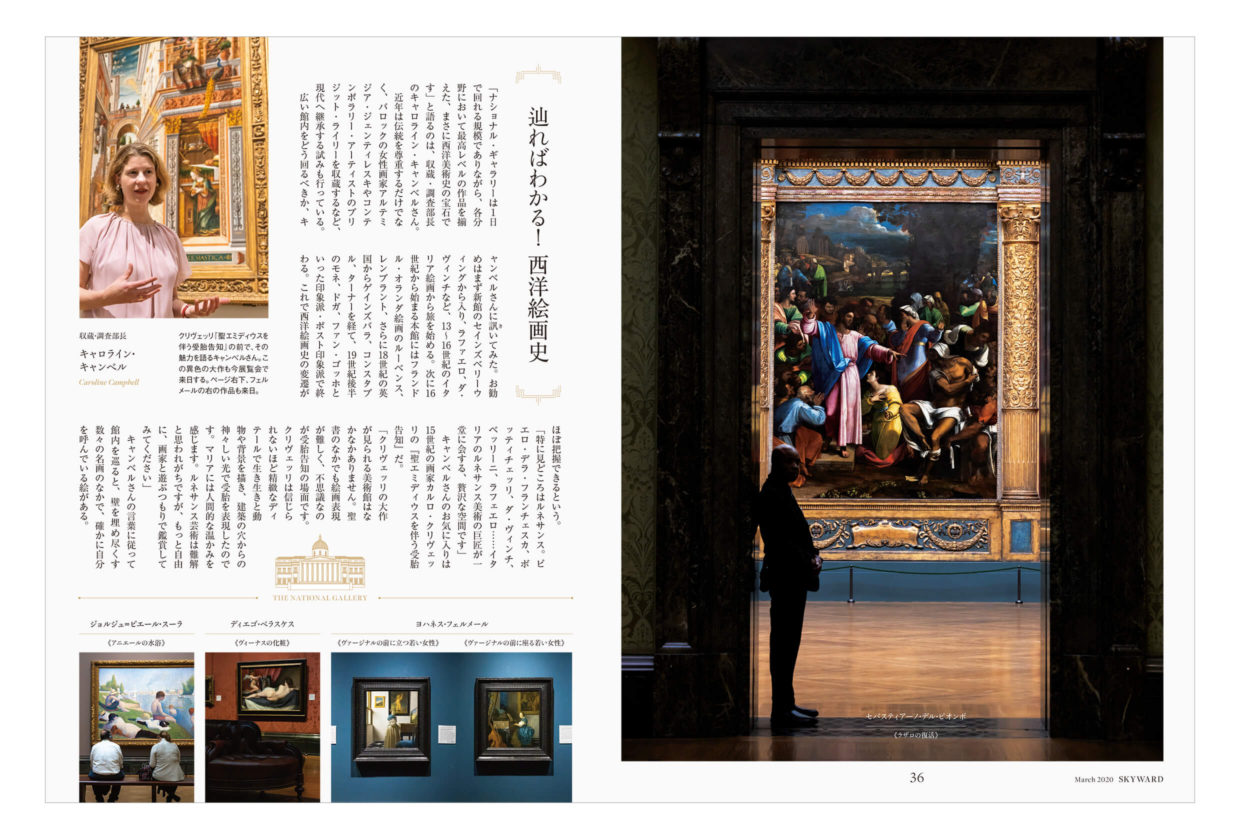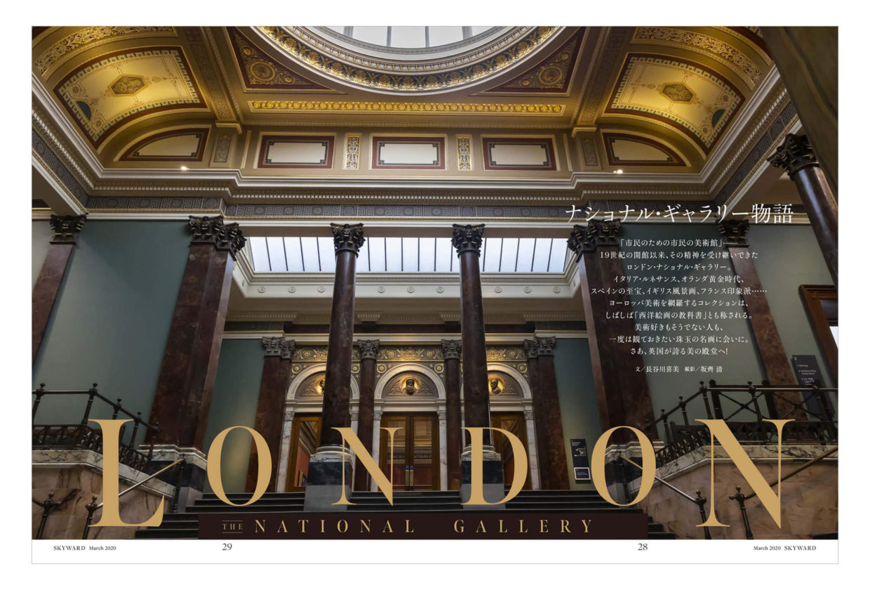 「市民のための市民の美術館」ロンドン・ナショナル・ギャラリー。表紙には、ドーム型の天井を内側から見上げた意外性のあるカットをセレクト。迫力のある写真を、レイアウトの妙でリズミカルに構成しています。