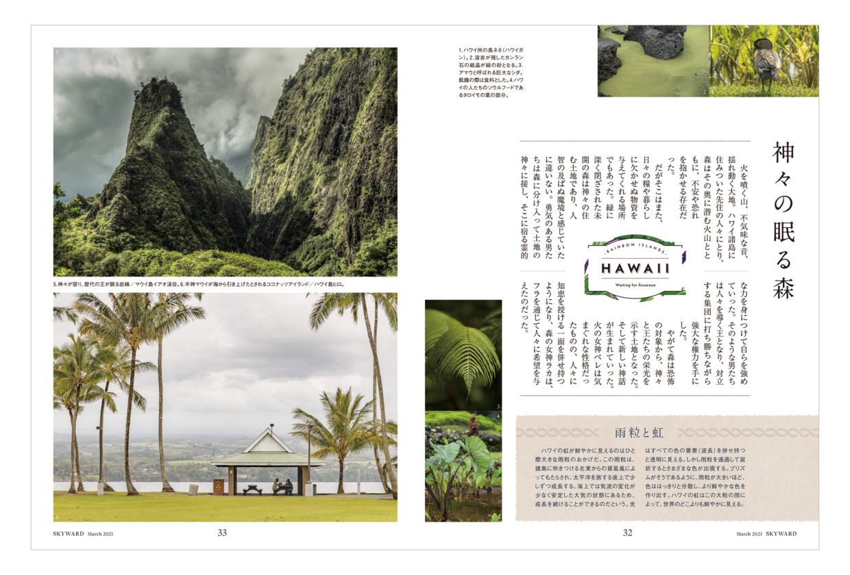 ハワイ語で虹を意味するアーヌエヌエ。現地には虹にまつわる豊かな言葉の表現や物語があります。赤、黄、橙、緑、青、紫。見開きごとに色で束ねて、光に満ちたハワイの大気を描いていきました。